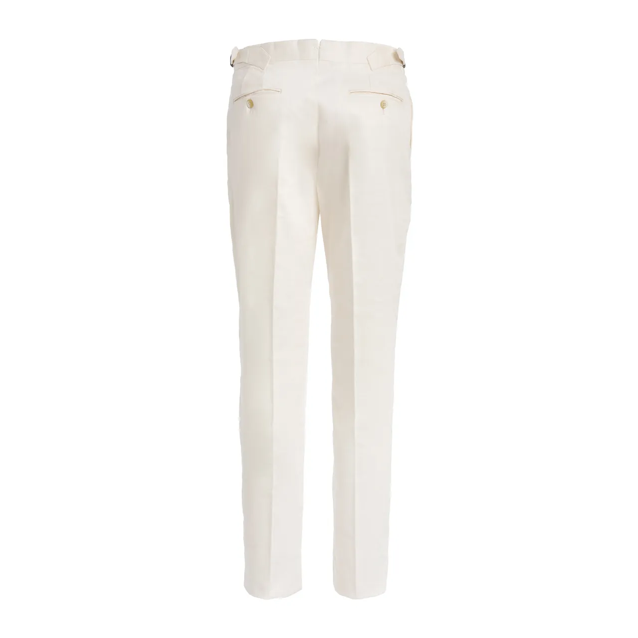 Kézi kidolgozás és tökéletes illeszkedés: ez a darab hibátlanul ötvözi a kényelmet és az eleganciát. A nadrág pamut és len finom keverékéből készült, bőségránccal és oldalsó derékszabályzó pántokkal a maximális komfort érdekében. A ruhadarab a férfi divat klasszikusának újraértelmezése, időtlen, törtfehér színben.