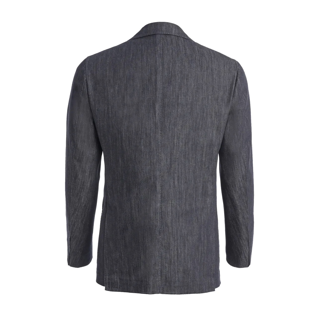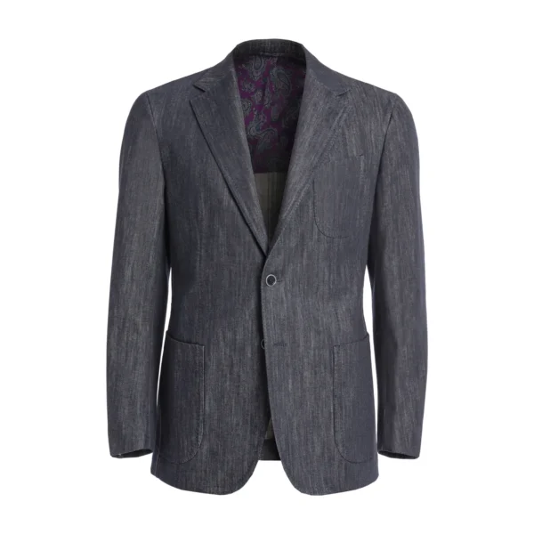 Kézi kidolgozás és időtlen elegancia jellemzi ezt az egysoros gombolású, háromgombos zakót, mely farmerhatású pamut anyagával kelt lazán elegáns hatást. Ideális azok számára, akik a stílus mellett a praktikumot is értékelik, köszönhetően a letisztult szabásnak és a félbélelt kialakításnak. A zakó két foltzsebbel és egy mellzsebbel rendelkezik. A jellegzetes nápolyi vállkialakítás és az aprólékos öltések a legmagasabb szintű kényelmet és kifogástalan megjelenést biztosítanak. A hozzá tartozó nadrággal kiegészítve teljes összeállítást alkot.